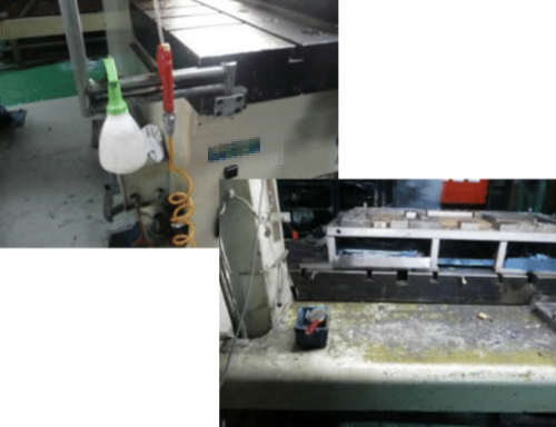 5S改善事例:プレス機裏側のシューターからはみ出たスクラップ処理